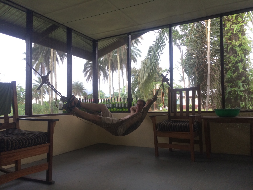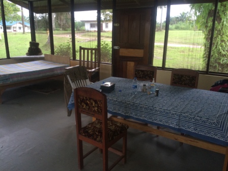I started off today with a nice bowl of oatmeal that I cooked for myself on the propane stove in the kitchen and enjoyed on the screened porch (a nice setting but what you can’t see is how humid it is already!). I bought some supplies in Monrovia, unsure of what I’d find for markets in Phebe. I also brought some maple syrup and honey from the US…the oatmeal was awesome with syrup! I do miss my orange juice, though, so I’ll be in search of some bottled juice at the gas station market. The guesthouse is a bit like camping in an Appalachian Trail hut. There are bathrooms with toilets that don’t flush, bedrooms with bug netting, a kitchen with a camp stove, and a screened area. Power only goes on between 6:30pm and 7:00am, the water only goes on between around 6:30am and maybe noon (otherwise there are buckets filled with water in each bathroom for flushing/bathing), and cooking is on a match-lit propane stove with a rusted burner trivet that almost doesn’t hold the pot. It takes some coordination to remember to charge my phone/computer only at night, shower quickly in the morning since the water may not last, cook before it’s dark during the “dead zone” of 5:30-6:30pm, and hope that a thunderstorm doesn’t knock out the power (like it just did 5 minutes ago…only got 30 minutes of electric tonight). There’s an interesting mix of 110V and 220V outlets that are identical to our US outlet prongs so they have duct tape signs that warn of 220V…luckily I haven’t fried anything yet. Here are photos inside the guesthouse: