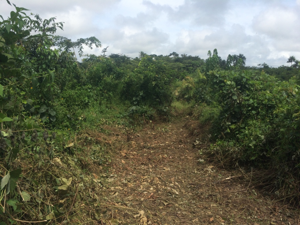 Much of the brushing that was done before the January 2014 groundbreaking is overgrown. I took some GPS coordinates and attempted to get some elevations but my iPhone wasn’t much help. The big issue we have in making any progress is getting a road in. With the rainy season, they still don’t seem to work on roads. Not sure how much Sam can do once the brushing is done…and there’s a lot of if to be done. Sam is coming from Monrovia tomorrow to visit the site and talk about our next steps–I hope he sees some steps we can take!