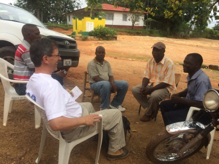 I met with Pastor Weekie, Nathaniel Sumo (they call him an “evangelist” and will be the one we work most closely with for this school project), Jackson Sengbey (council chair), and another gentleman you’ll see in the photo that I can’t recall. We will be getting a good deal of their support including 20-25 volunteers to brush the land and carry building materials in (which is a long walk!). One of the village “mothers” will be cooking and providing water for the work crew. We need a place to store building materials (mostly 350 bags of cement @ 110lbs. each) so they can be transported to the temporary warehouse we need to build first. We drove to a small village, parked the truck and walked through the bush to the property.