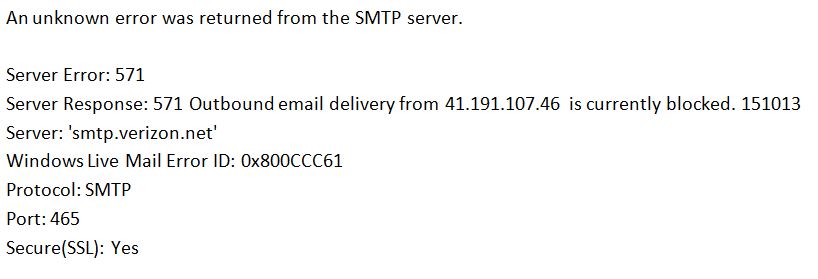 Second, I have not been able to send emails since the weekend (I can receive fine, but outgoing emails are blocked). My theory is Verizon sees an IP address from Africa and categorizes with those Nigerian-prince-wanting-to-transfer-money spam emails. I’ve done tech support chat with Verizon and did what they told, but no luck. Since I can’t email anyone, I’m appealing via this blog to Kathy and anyone else who might be able to contact Verizon to get this fixed. Here is one of the error messages I get:
