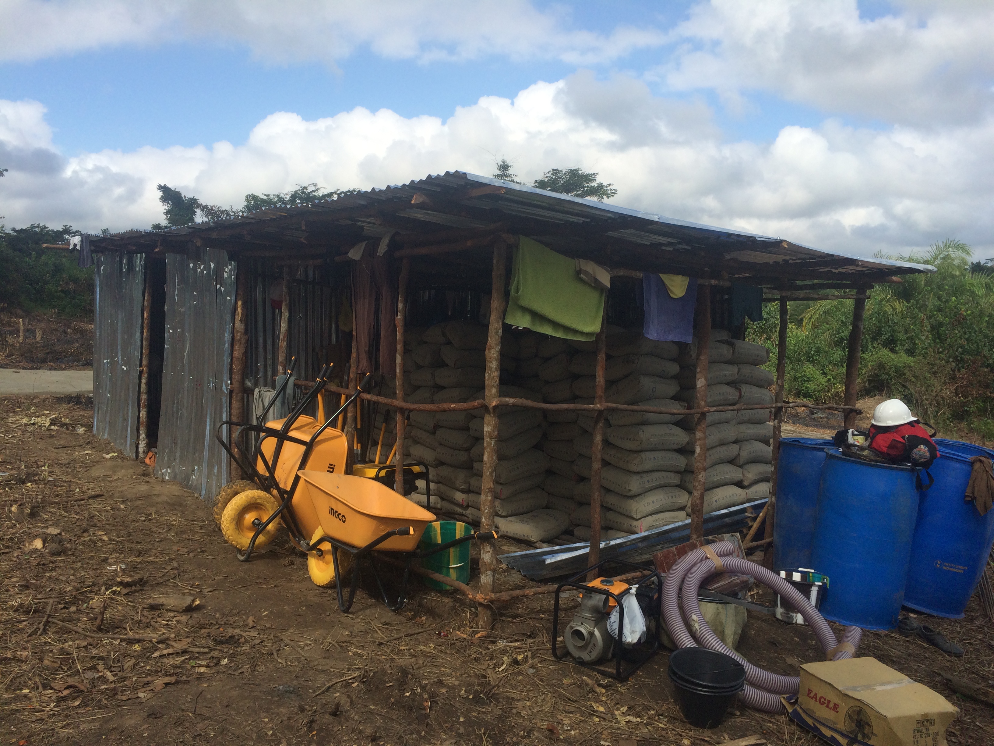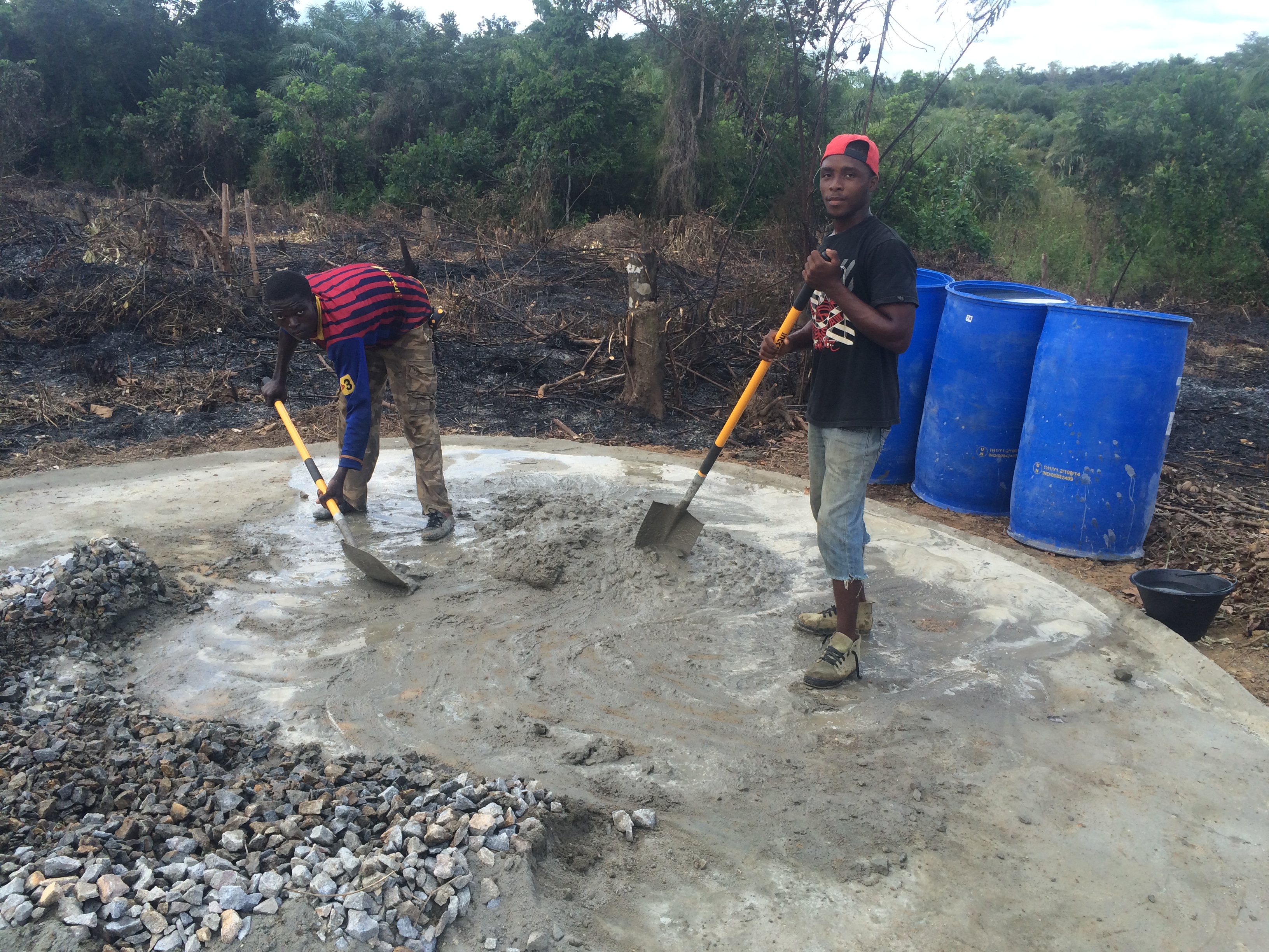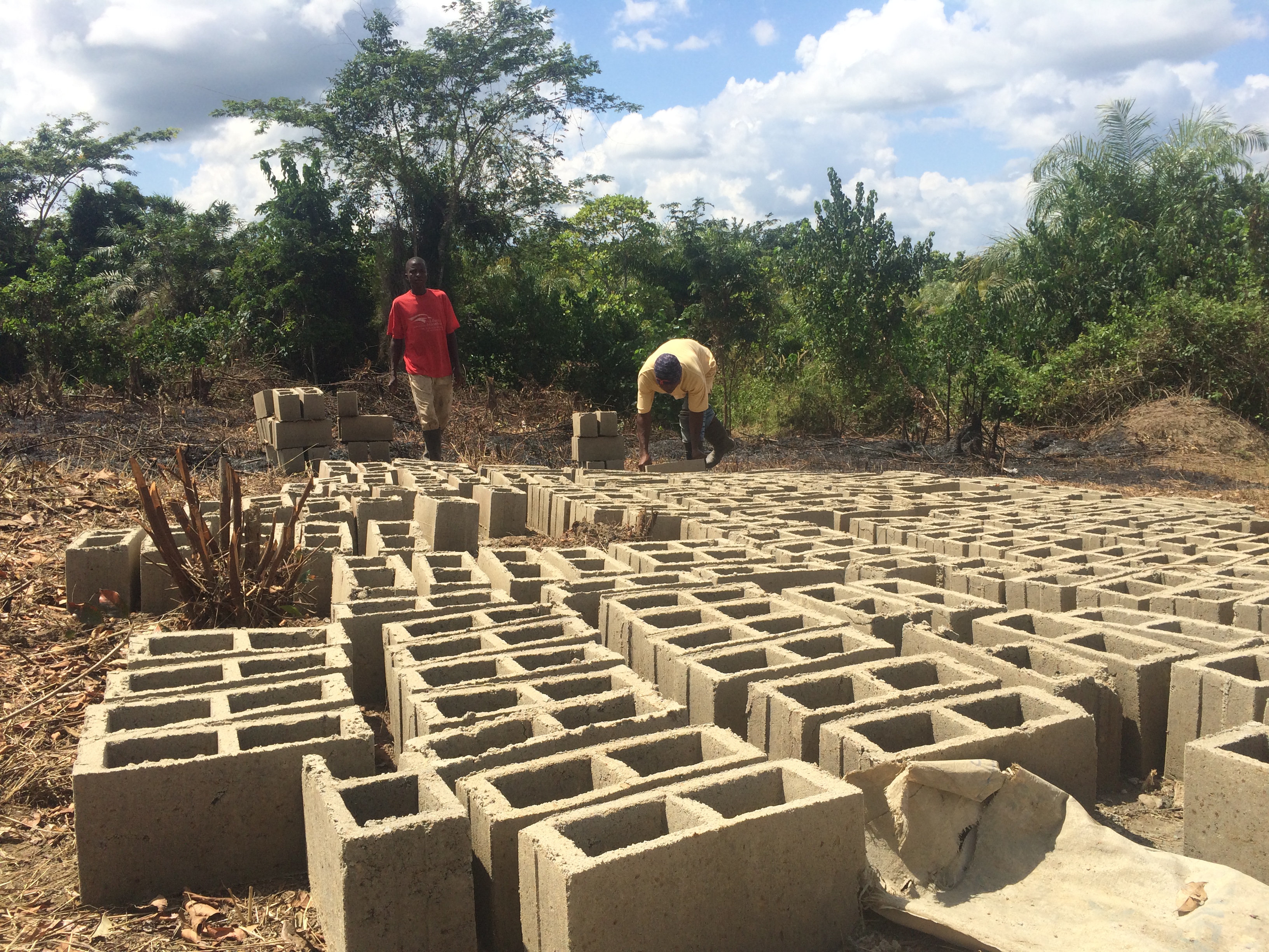 Sam was glad to see me as work has been progressing well but they needed more sand and other supplies (click here to see panoramic overview of work site: https://youtu.be/QNF6EPzWRDM). In these photos you’ll see the temporary warehouse (more siding was needed to totally enclose it but you can see the 300 bags of cement stacked in there). Inside of one half is the workers’ sleeping quarters complete with mosquito netting. The overview shot shows the cement-mixing-circle on the far left, the warehouse in the center, and the foundation trenches for the permanent warehouse on the right. These gentlemen take time to do laundry! The fifth photo is the block yard…they hand make each block in the molds we purchased in Monrovia…we’ll need nearly 2,000 blocks to complete the warehouse (see video here: https://youtu.be/2d83T2QvHCY)