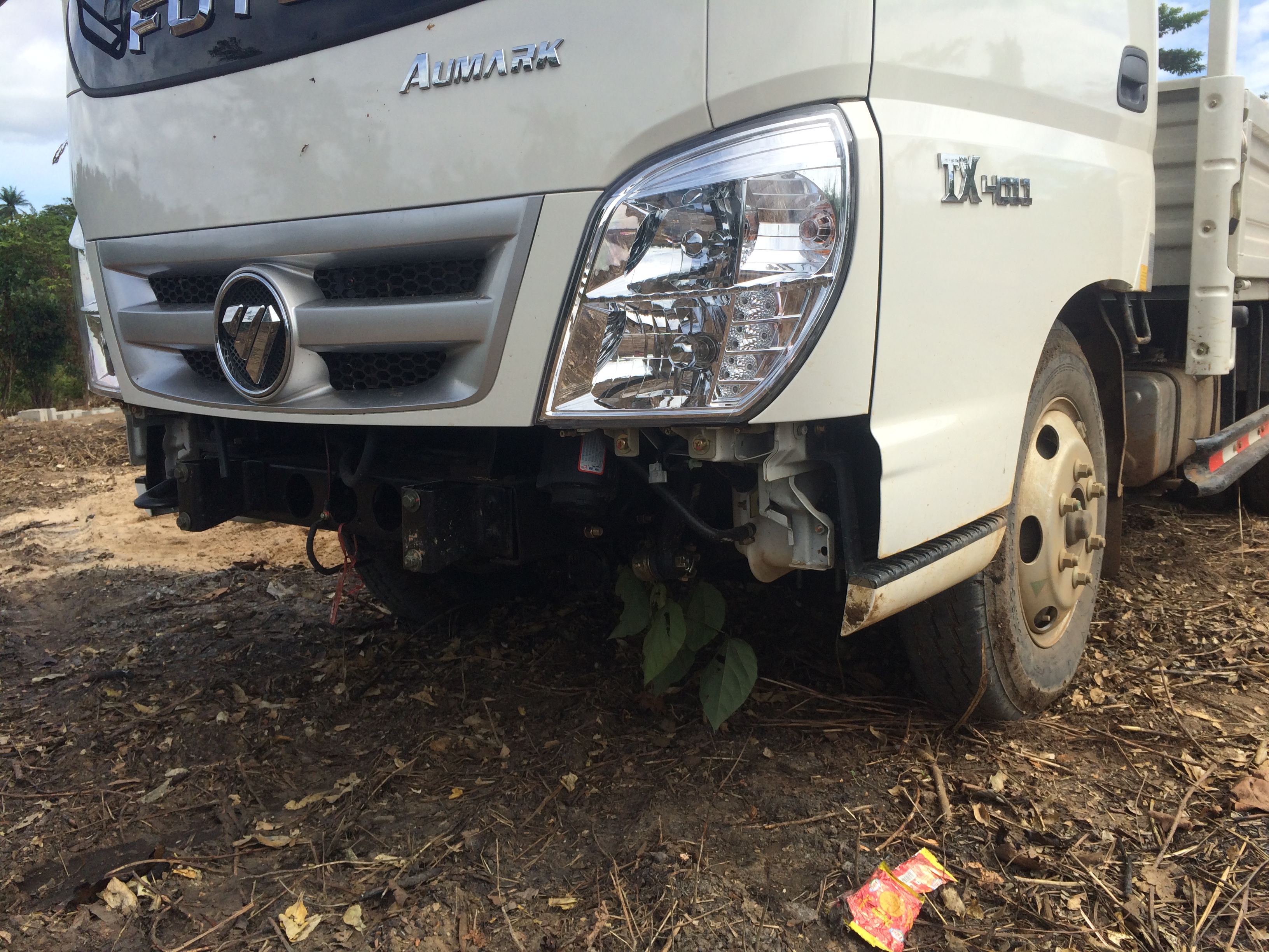 After the first sand load when the front bumper’s plastic housing covering the structural metal scraped dirt and grass with each bump, baby FOTON underwent a bumperectamy to increase my baby’s ground clearance. I spoke gently to her and rubbed her tires as my Liberian jungle doctors extracted her newborn metric bolts and surgically separated the offending body parts. She knew it was for the best…a father knows these things. Here are before and after photos:
