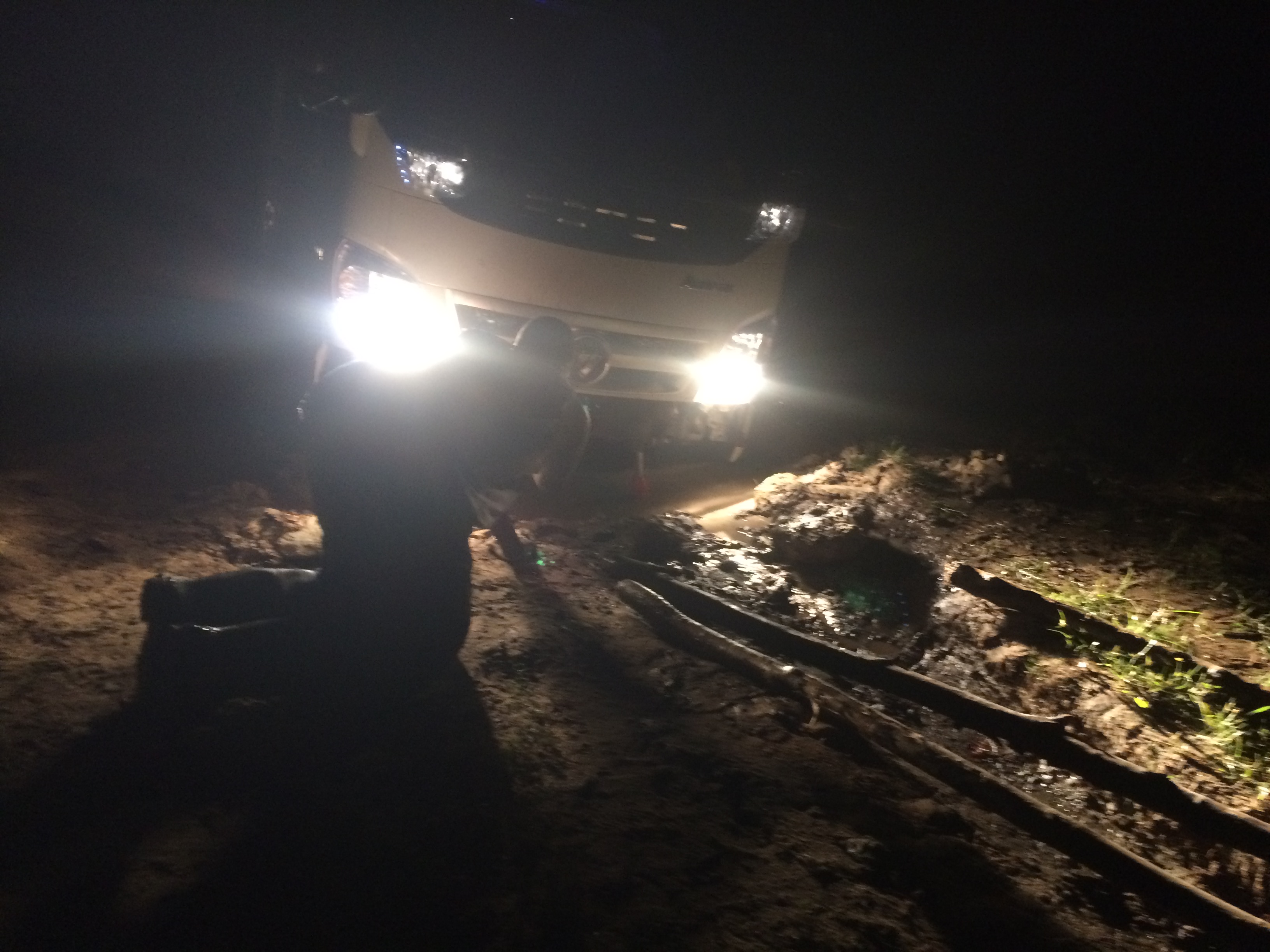 Two passersby stopped and the very large “refrigerator” of a man said it would be no problem to move this light truck. He came back in a change of clothes and some high boots at which point my other helpers had returned. Various strategies of pushing and rocking the vehicle, prying the driver’s side up with wooden poles, jacking and propping were used without success…it’s now 8:30pm, dark, and lightning is flashing in the distance. As I stepped in the mud I kept thinking of the cable TV show “Monsters Inside Me” that