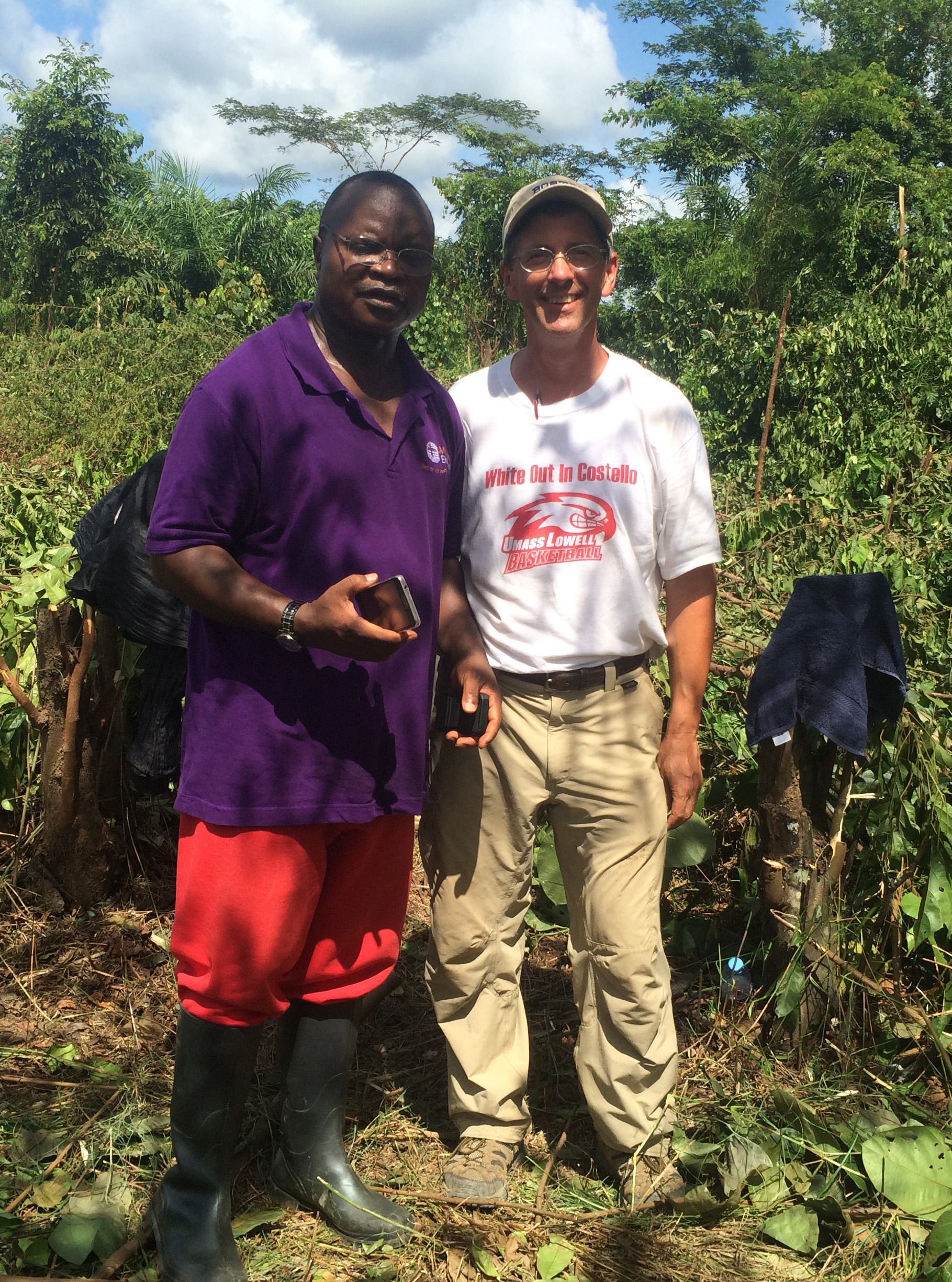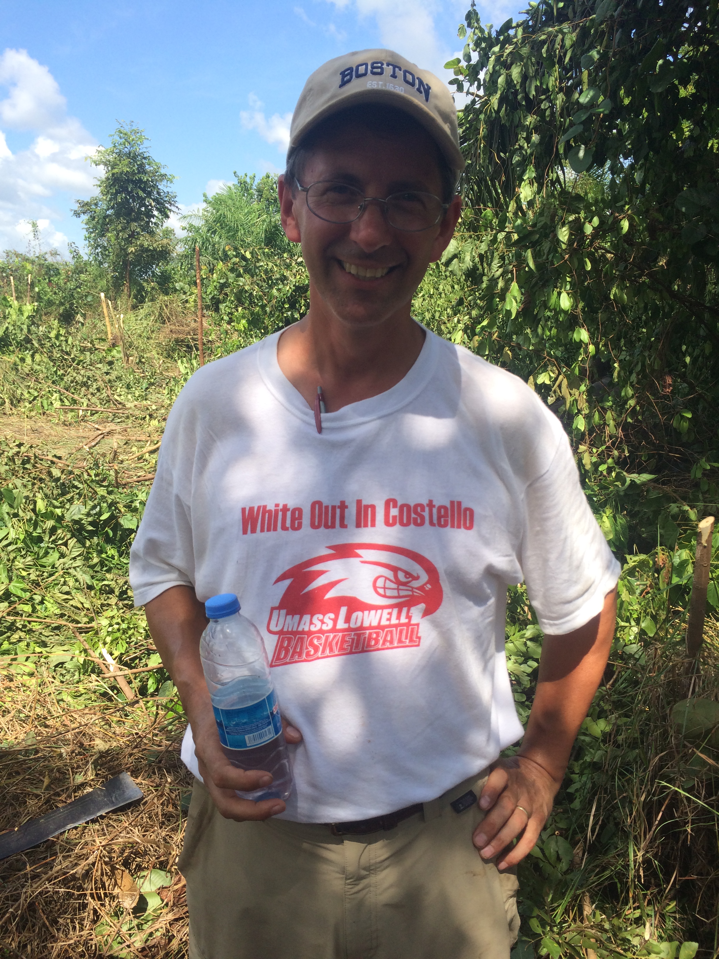 My biggest difficulty was keeping them focused on where I wanted brushing done in preparation for the next two buildings. For some reason, they were determined to find one of the cornerstone markers that I didn’t really care much about. Eventually they redirected but much later in the day than I had hoped. Bishop Seyenkulo came first thing in the morning and then again at lunch time to show his support. The financially-assisted lunch (thank you donors…you know who you are!) was appreciated and some of the boys from my little band of followers also had a meal. I shared photos of my family and fall foliage pictures my Mom emailed to me (I definitely miss seeing the fall trees while here.) After I took photos of the cooks and volunteers, one of them borrowed my camera and began taking pictures of his friends and me…so here I am in my usual stance holding a bottle of water…re-hydrating is nonstop.