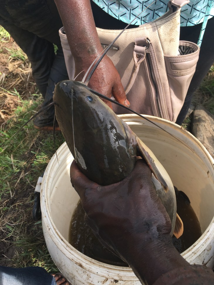 I had the opportunity to witness a harvesting of fish from the fish farm where my friend, Eric Hanson, is working in Suakoko. Some very large catfish along with “plank fish” and talapia. Although we purchased a few pounds, I think the cost might be prohibitive for the rice and “soup” on our school lunch menu. I shuddered inside as I saw old mosquito nets being used to corral the unsuspecting fish…Sue would not approve!