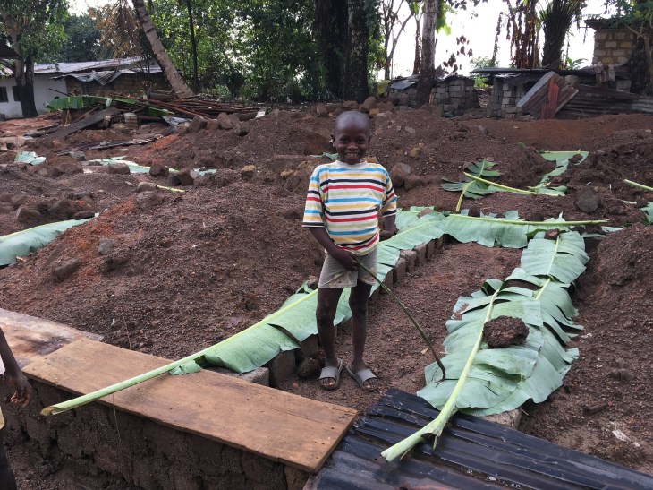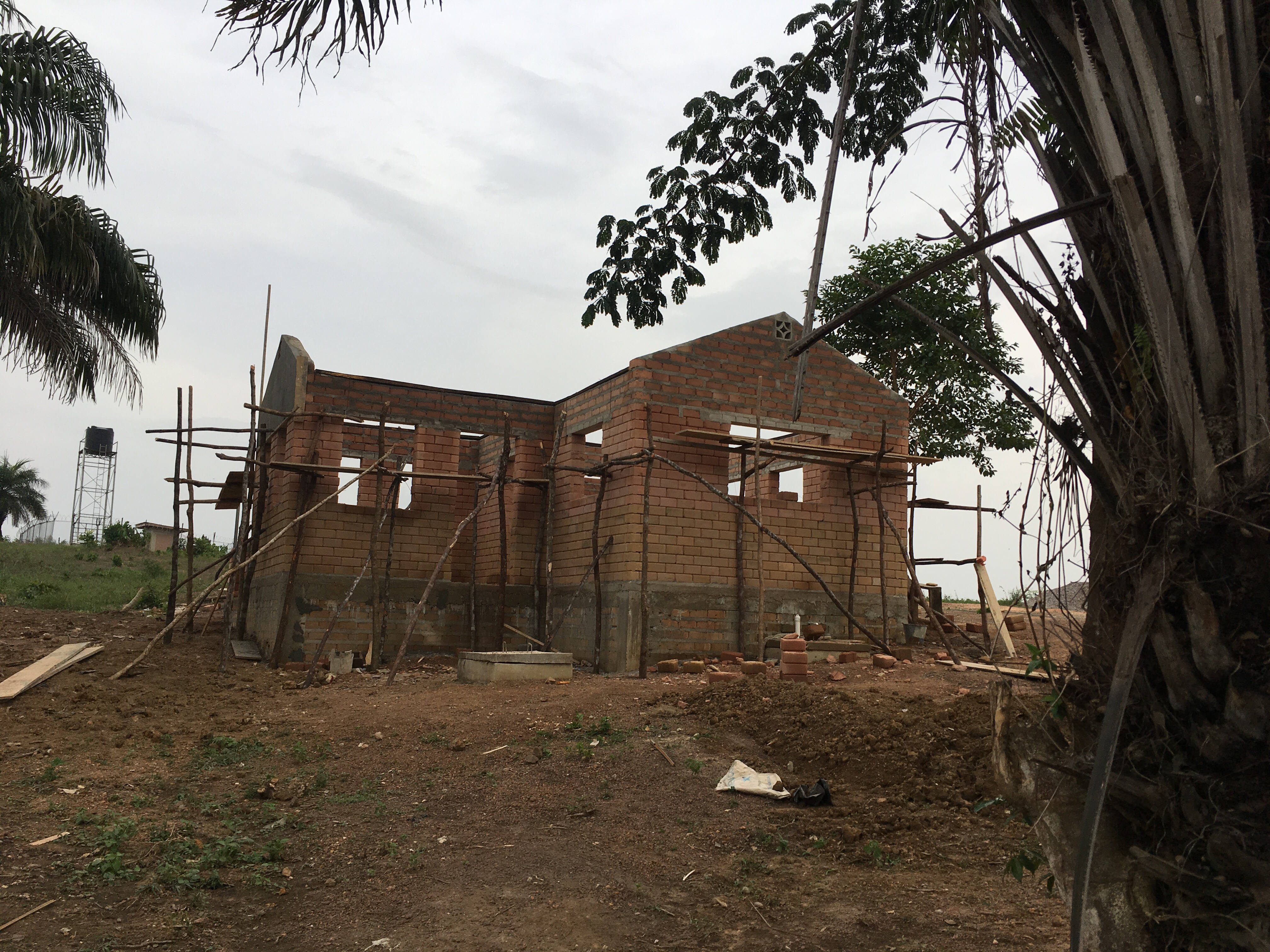 For those of you following the ups and downs of Sando’s life, she eventually found another room to live in with her two children the day before demolition of her former house where she rented a room. Construction of a larger mud block house has begun and now the race is against the weathe. Rain is the enemy that converts mud blacks back into a pile of soggy earth if you don’t work quickly enough. Children are responsible each evening for covering the day’s construction progress with banana or plantain leaves-this is jungle for “tarp”. Many times as the rainy season approaches, families will construct the roof first, using wooden poles to suspend it as they stack block walls below it as insurance against a muddy demise should a heavy rain occur.