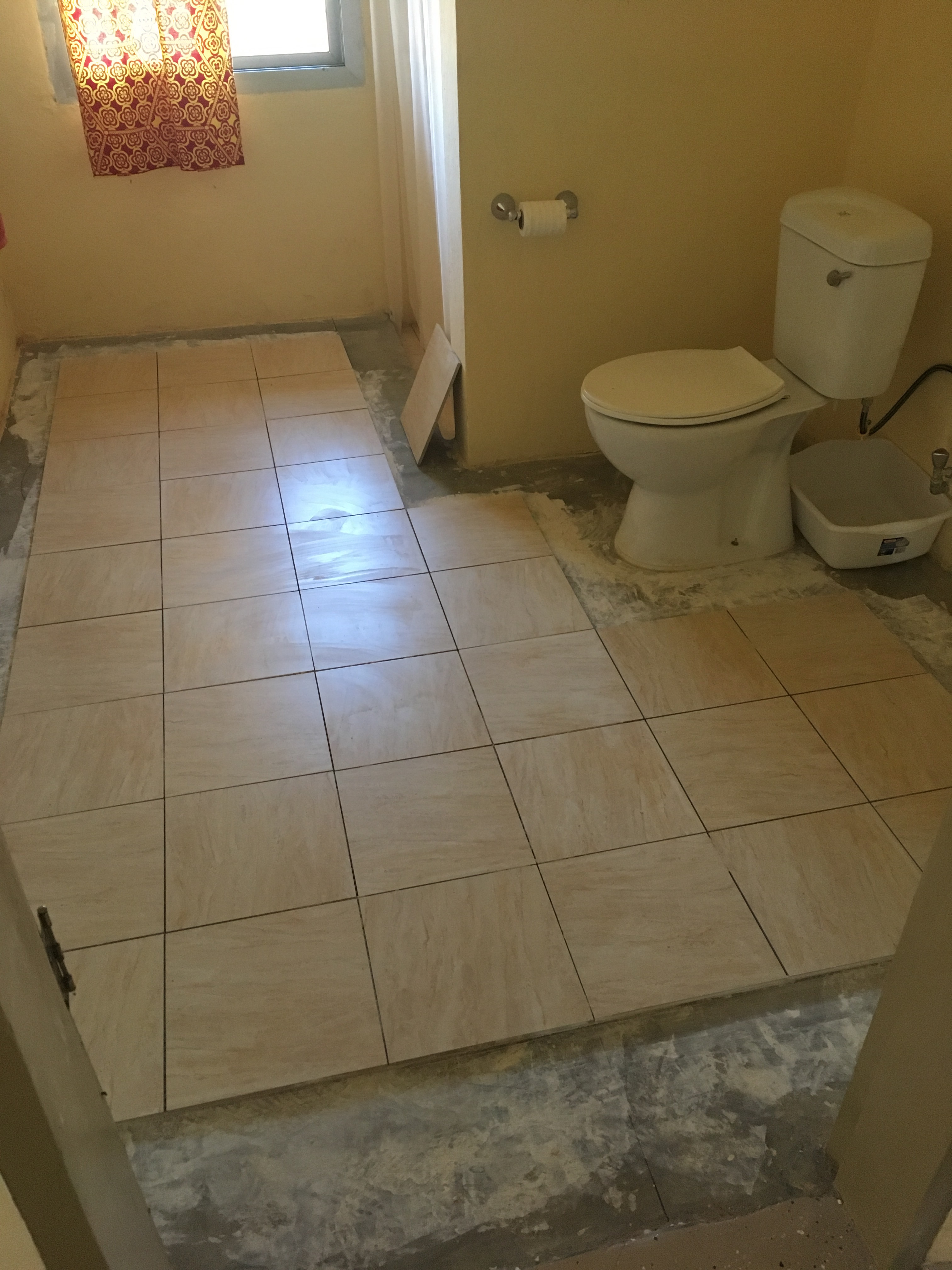As I’m still without the truck, I moved on to more guesthouse work. Curtain rods for the windows were cut from 1/2″ galvanized steel pipe and placed into the wooden brackets I made and mounted back in March. I began tiling the bathroom floors, leaving all the perimeter cuts in one bathroom for when I have electricity and can use the diamond blade on the angle grinder. I left most of the second bathroom un-tiled so I could still access the necessities of a bathroom and not resort to the bush (or “norZOO” as it sounds phonetically in Kpelle). I had three assistants – one that watched, Titus (school janitor) who mixed thinset and hauled water for me, and Annie (the woman that cleans and does my laundry) who handed me tiles and practiced laying a few.
