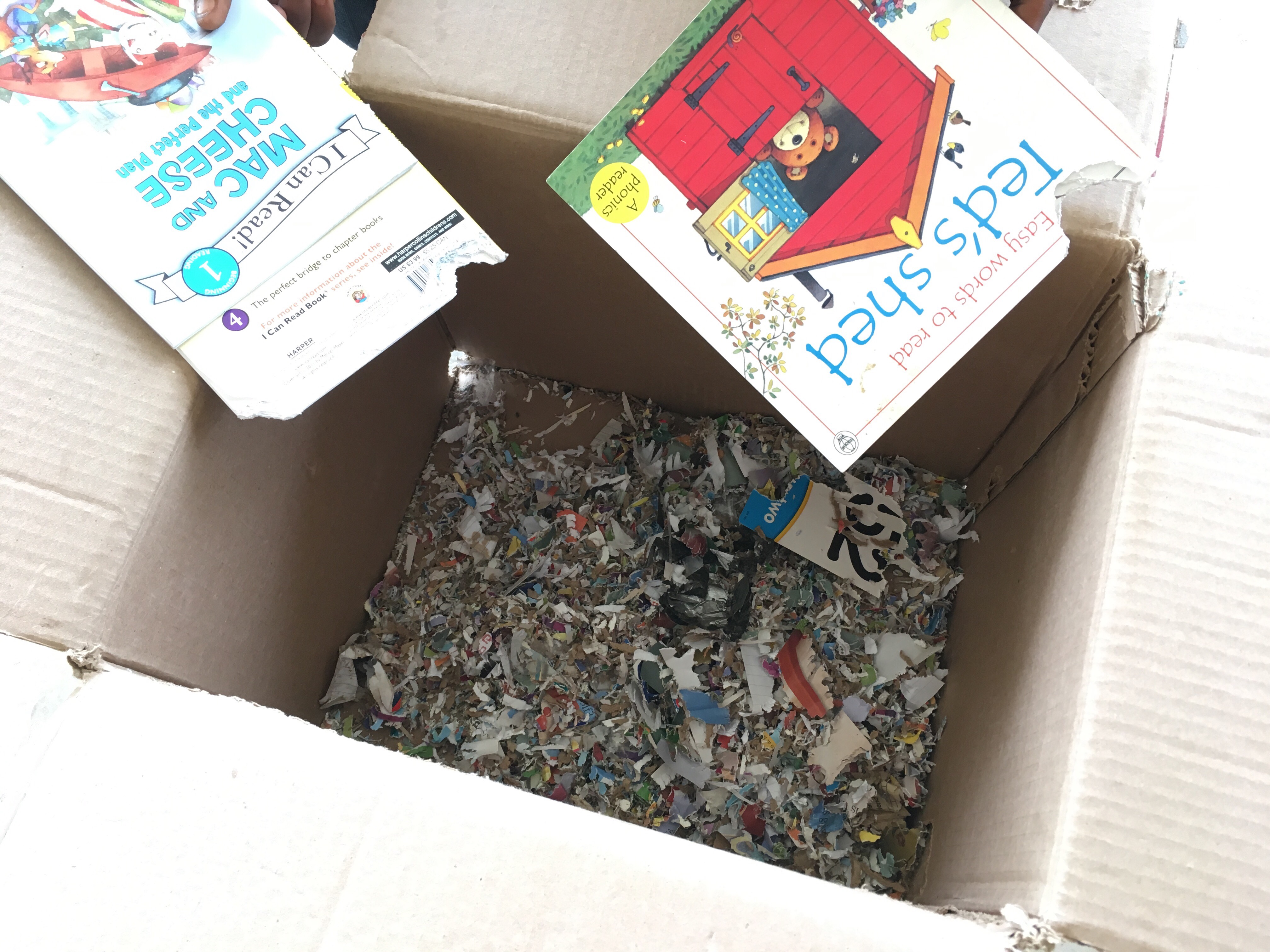 We’re having a rat problem in an unexpected location…the school office. I know it stems from our staff leaving extra food in there that sometimes isn’t well contained or little morsels remain. The wooden office door has a corner chewed through from these vermin to forcing entry. This photo shows that one even chewed into a cardboard box of donated children’s books and shredded half into bedding material.