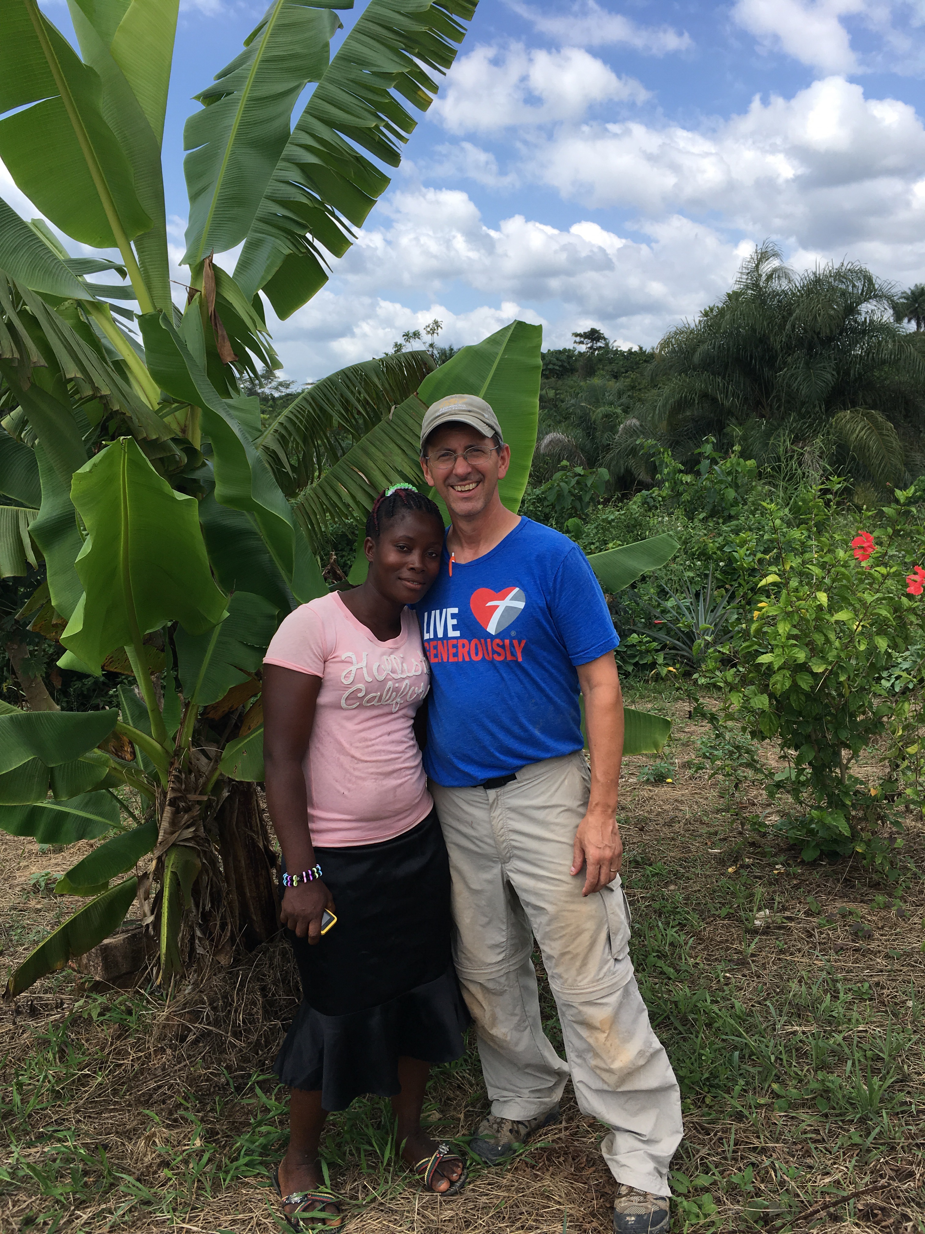 The last day in Liberia is usually the busiest – except for this trip when the last three days all seemed like a last day. Everyone who wanted to have “a talk” came visiting me at the guesthouse. The Makor family (which has three children in our school and extended family back in Providence) came to share appreciation and get a family photo. Moses needed help writing letters to both “Auntie Kathryn” (my wife) and his “friend” (my daughter Kim…I’m not sure she’s aware of this friendship but she’ll know soon). Annie, the guesthouse caretaker, made a loan request so she could buy flour, oil, sugar and other ingredients to make “small bread” or donuts to sell. Two school children brought enormous freshly harvested pineapples as gifts for me. My mutual friend of the late Sando, Mary, came to see me, cried a little, then wanted a photo together (see below…we’re standing next to one of the many banana trees planted by Sumo).