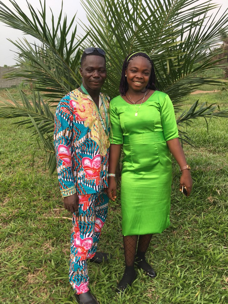 As with most things Liberian, there was a musical and spiritual aspect to the event. The graduating class of about 50 shuffled and swayed in unison as music accompanied their entrance into the hall. This took a while because the shuffling was slow. After prayers and a song by class members, the talking began. Introductions and thank you’s…thank you’s and introductions…both were followed by platitudes and wisdom sharing speeches. Over two hours into it, I decided to leave because the bestowing of graduation certificates didn’t look like an impending item on the agenda. I felt badly since I didn’t get a chance to be introduced to Isaac’s wife, Tarnue. I was so happy that later in the afternoon they made a special trip to GLTC to say hello. Isaac made a point of saying how much it meant to him that I went to the graduation ceremony. I love this photo of both of them at a palm next to the guesthouse. Tarnue is so pretty in her green dress which all the female graduates wore and Isaac…what can I say?! Who among us can pull off an outfit like that?…not me.