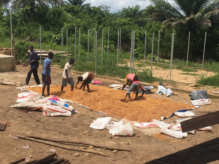 Bendu and Tumamee started the “official” preparations today. The gang of boys was hanging around as usual so we put them to work, too. We had stockpiled wood dust in the warehouse and needed to bag it for transporting to the poultry area.