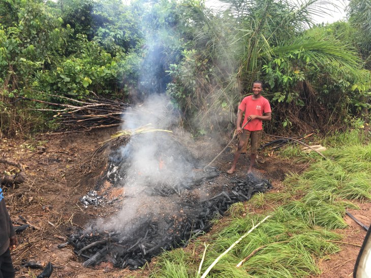 Jerry unearthing a charcoal mound to “harvest” the coals for his cooking fire.