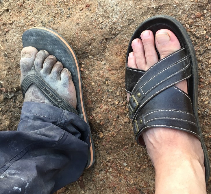 A contrast in footwear and foot wear.