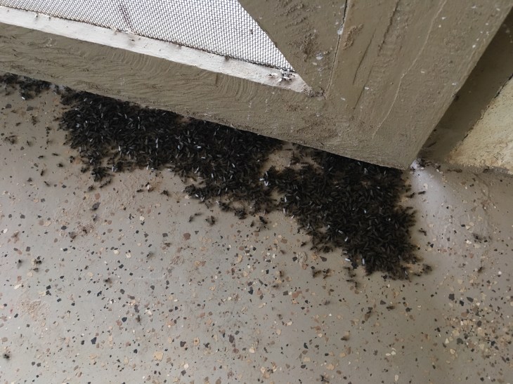 Here are piles of small flies that accumulate at the guesthouse door just below the light on some nights when a storm is coming. Enough to shovel with a dust pan.