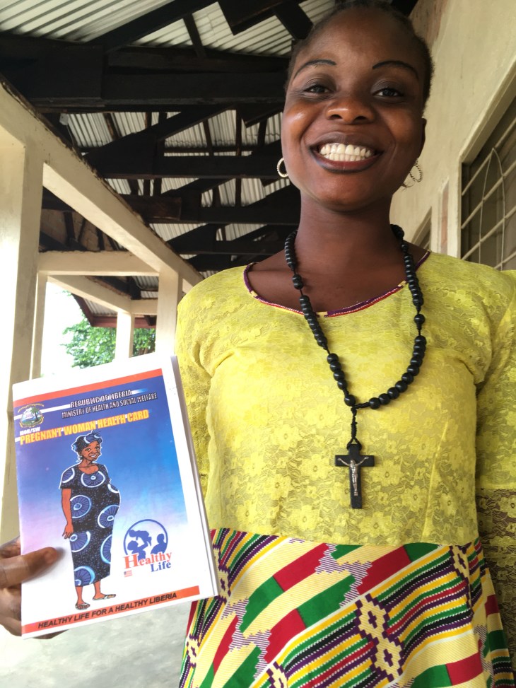 Amelia is 16 weeks pregnant (shown here holding her “Pregnant Woman’s Health Card” from her first prenatal visit to Phebe.) Imagine American women waiting 4 months for their first prenatal visit.