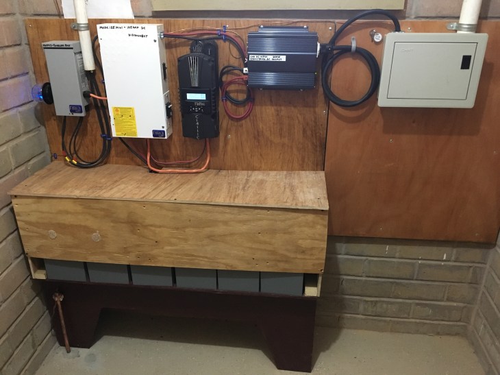 Here’s the final school solar set up with the battery bank protected by the plywood enclosure.