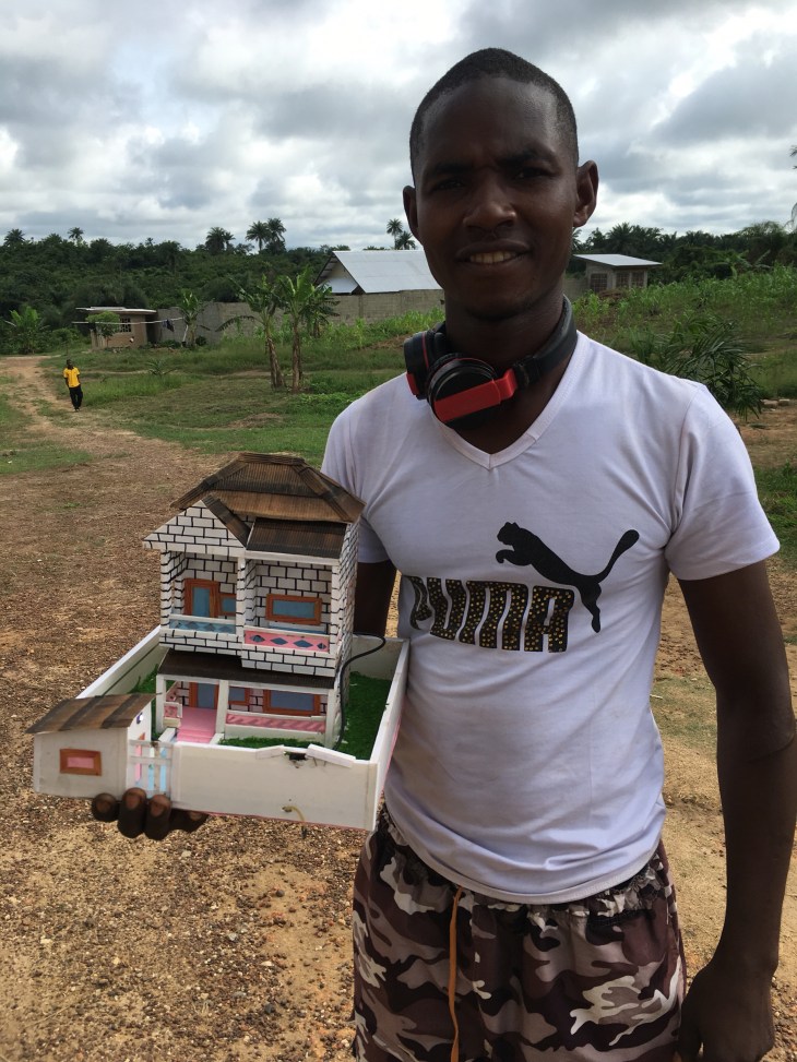 Here is Edwin, the electrician, holding a cardboard model of a house he made – complete with lighting on the security shed and inside the house. Reminds me of things I would build as a kid.