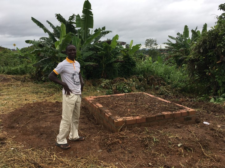 I was early for church and took the opportunity to walk across the street with Sunday Binda to see the progress made on constructing a sample building from our blocks as part of our roadside advertising. I was happy to see they had a foundation for this 5’x6′ display edifice already and would soon be pouring the concrete floor. Finally, some progress. John 2 had some time yesterday so he welded up a sign board. Next is to get it painted (I hope it’s still not raw metal when I return on my next trip!).