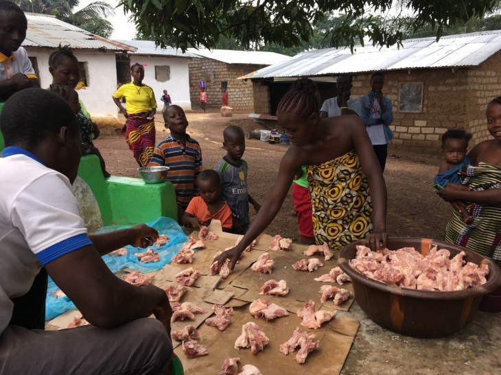 People banter back and forth about the inequality of portions in one pile of five versus another so as not to cheat the recipient. Each pile costs $160 LD. One individual holds the log book and calls the names of those participating in this month’s carton purchase. Some walk away with a bowl of chicken parts balanced on their heads while others borrow a bowl, run home, then return with the empty bowl for someone else to use. An interesting slice of village life.