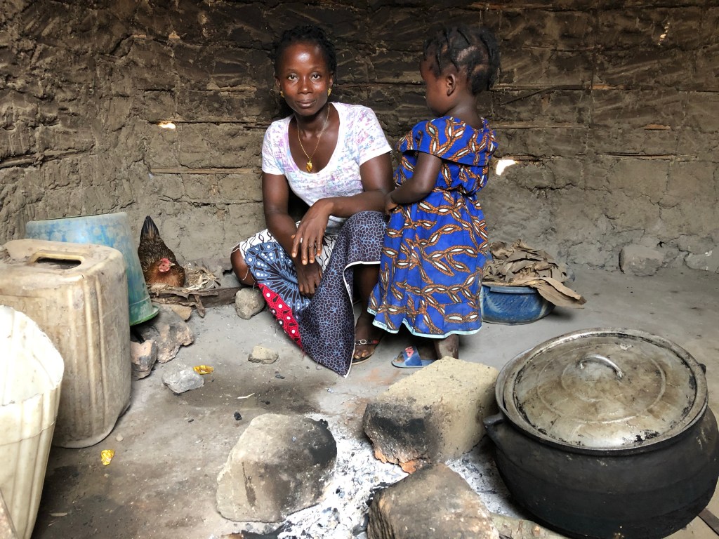 Upon our arrival, Kalalee was very proud to show me her 4-room mud home and the adjacent kitchen — a separate building approximately 8 ft. X 8 ft. square with a thatched roof and wood plank door. As you see in the photo, it’s complete with a hen that just helped out with a few eggs. The walls are blackened from the trapped smoke (no chimney, just a front door). Woven mats create a ceiling with storage for sheaves of rice.
