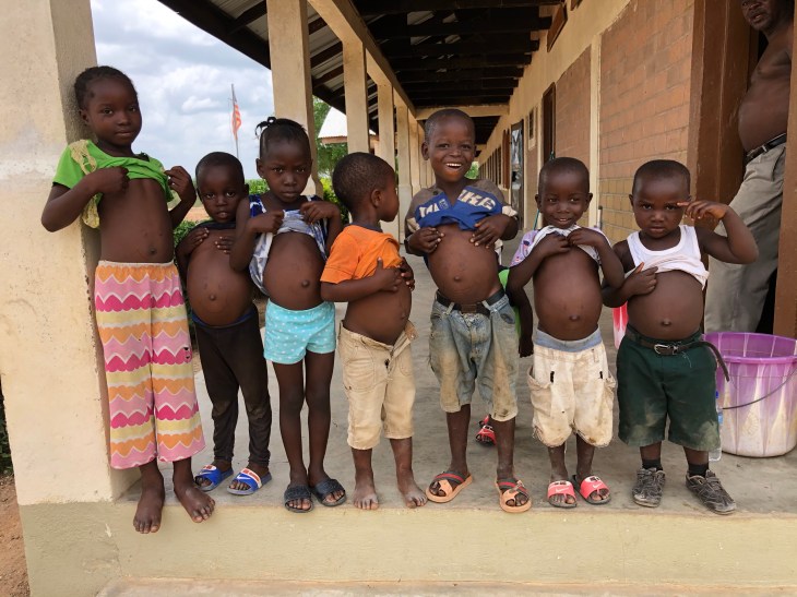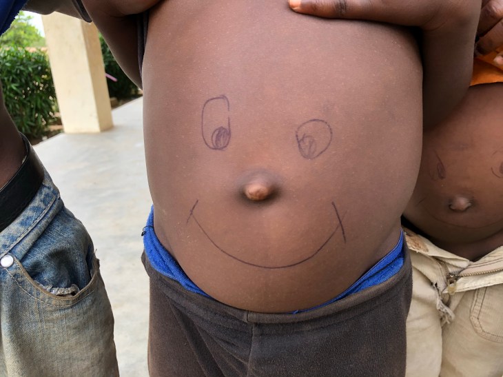 Kids of a certain age are easy to entertain. This group gathered after I drew a smiley face on the stomach of one child, using his outie bellybutton for a nose. I immediately had a line wanting the same thing. They proudly pulled up their shirts to pose for this group shot.