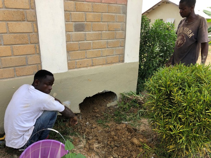 That was the fun part of my day. At the other extreme was a long-neglected leak repair. For 2 years I’ve been telling them there’s a leaky pipe under the cement floor by the boy’s bathroom because the foundation wall has been perpetually damp. Unfortunately, self initiative is not a strong suit so some things don’t get accomplished until I simply say “do it”! We got a plumber who was the former trade school teacher of our electrician, Edwin Suah. He and his two apprentice helpers chiseled out the toilet (they cement toilets in place here instead of bolting them to the floor) and busted through both the cement floor and the adjacent exterior block wall. We uncovered a cracked PVC elbow in the supply line to the toilet. We had to run around getting pipe fittings, cement, plaster, etc. He’ll be back tomorrow to finish up. So far, no leaks.